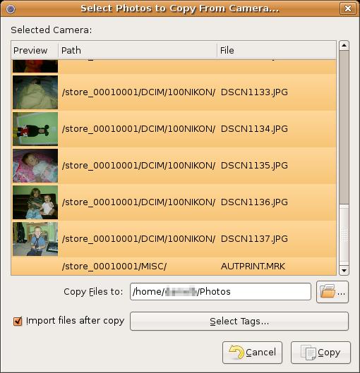 Importing from a digital camera is likewise a very easy process. Simply connect the camera to your computer, and choose the camera from the Import Source drop-down menu. F-Spot recognizes most digital cameras automatically.