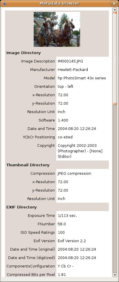 Digital cameras record all sorts of information in the picture files they create, such as the f-stop used, whether the flash fired, the manufacturer and camera model, the exposure time and much more. You can use the Metadata Browser, found in the View menu, to look at this information. It is not editable, but it is interesting to look at, especially if you are a photography enthusiast.