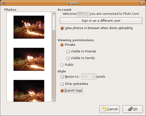 Apart from desktop and e-mail integration, F-Spot also can interface with the Flickr Web site. Flickr is a photo storage and sharing Web site owned by Yahoo. Access this option from the Export submenu of the File menu. F-Spot takes you through a brief setup process the first time you use it and from then on it remembers you.