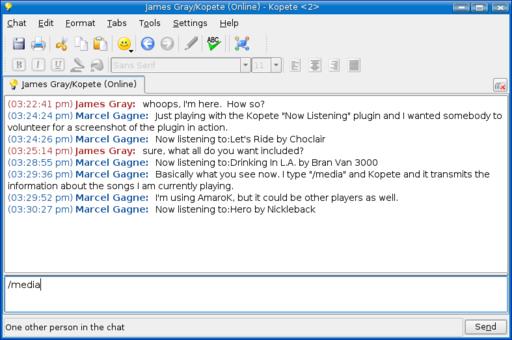 François and I were discussing the joys of sharing music we enjoy with friends (and anyone else who shares an interest for that matter). Your Linux system makes this easy with the right programs. One way to share your entertainment, mes amis, is simply to tell the world. Kopete, the multiprotocol instant messaging client distributed with KDE, has a neat little feature that lets you do just that. Say you happen to be logged in to an IRC channel or having a chat with a friend on-line, using Jabber, Yahoo or some other service. Typing /media in the chat field at the bottom of your chat window is all it takes. The system then transmits a message telling your chat partners the artist, title and album of whatever song you are listening to (Figure 1).