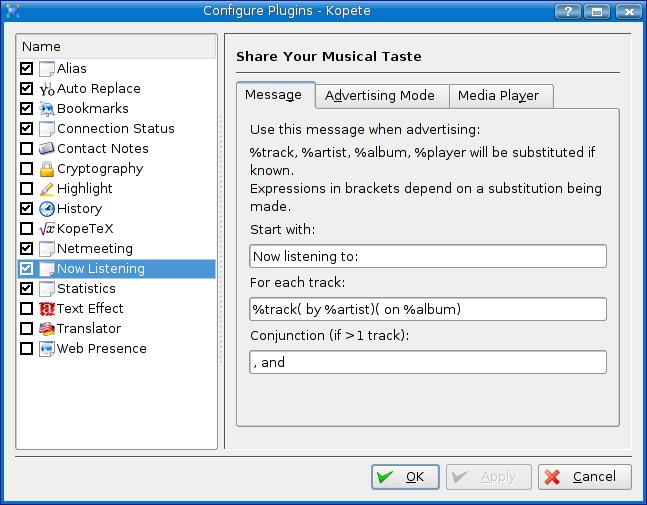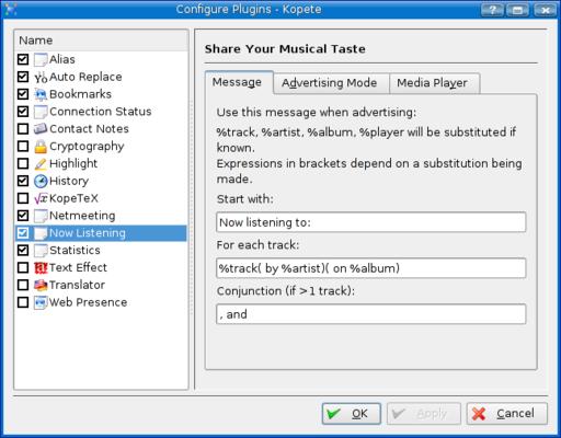 Figure 2. Activating and Configuring Kopete's Now Listening Plugin