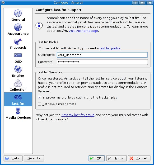 Figure 5. The latest Amarok allows you to broadcast your musical tastes via Last.fm.