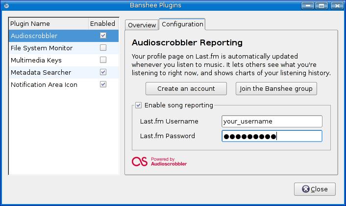On the GNOME side of things, there also has been some recognition of Last.fm's popularity with music lovers. That's reflected in the excellent Banshee music player. To start telling the world what you are listening to with Banshee, click Edit on the menu bar, and select Plugins. The Banshee plugins configuration window appears with the Audioscrobbler plugin selected. Click the Configuration tab (Figure 6). Click the check box that reads Enable song reporting, enter your user name and password, then click Close.