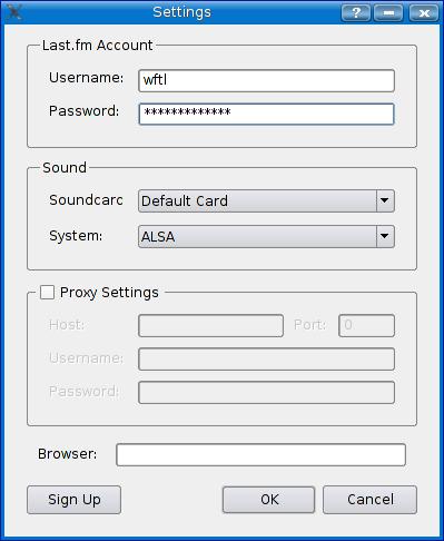 To use the player, unpack the bundle into the directory of your choice (tar -xjvf LastfmLinux-1.1.4.tar.bz2). There is nothing to compile here, so running it is as easy as switching to the directory into which you have extracted it and running the player (./player). When you run the player the first time, the setting dialog appears. This is where you enter your Last.fm account information.