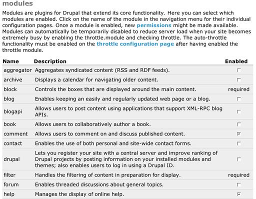 A module is additional code that extends Drupal's functionality. Drupal comes with a set of core modules, and additional modules can be downloaded and installed as needed. The Drupal Web site lists a large collection of contributed modules created by the community. If you need a particular feature, look for a module that offers it. Several modules may offer similar features or even different implementations of a single feature (Figure 1).