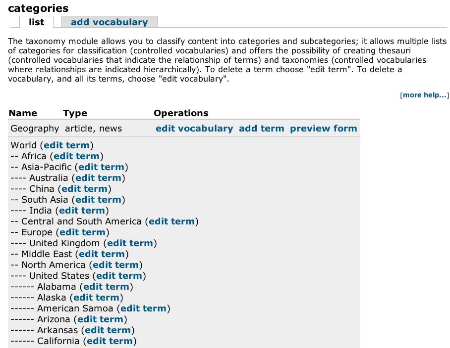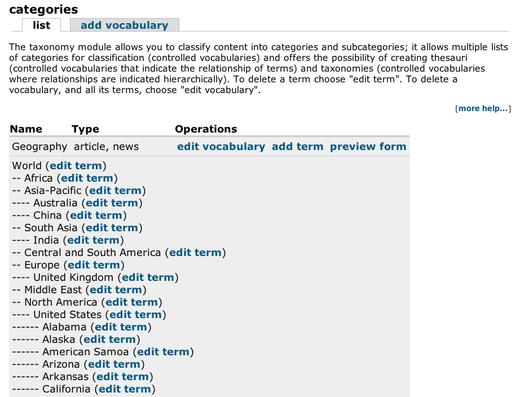 Drupal's taxonomy system enables you to associate a node with one or many descriptive terms. You can create multiple sets of terms called Vocabularies. Vocabularies can be flat or hierarchical lists. For each vocabulary, you can specify which node type it applies to. This combination can help you create a classification system for content that suits your particular information architecture needs. Many other features and modules depend on the taxonomy. For example, you can generate navigation elements, control access to content or switch visual presentation based on taxonomy. Take the time to develop good taxonomy vocabularies and design them so you can expand them easily in the future (Figure 4).