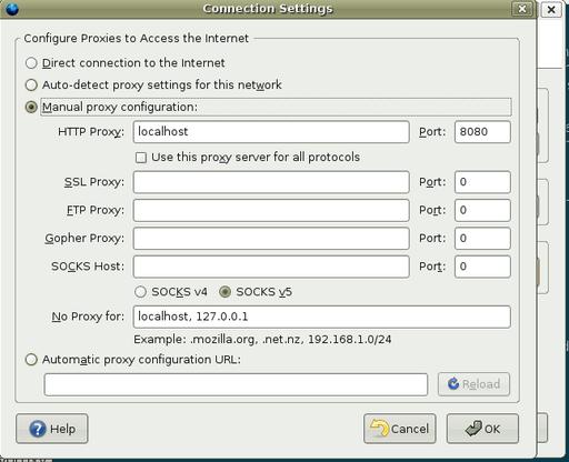 This last installation step points the browser at port 8080, so it sends data only through DansGuardian and Tinyproxy. With Firefox, go to Edit→Preferences→General tab→Connection Settings to see the screen shown in Figure 1. As shown, select manual proxy configuration, enter localhost and port 8080. This assumes you are going to install and use DansGuardian and Tinyproxy on every workstation. If you set up DansGuardian and Tinyproxy on a separate server, then you need to enter the name or IP address of the server machine that runs DansGuardian and Tinyproxy instead of the word localhost in the HTTP Proxy: line.