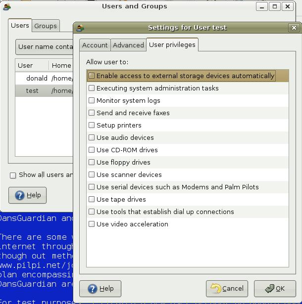 For test purposes, I created a new user account on Ubuntu Dapper Drake (Figure 3). Using the checklist features, I severely limited the capability of the user test. Although these privileges could be just right for anyone who has no computer experience or who is plainly not trustworthy. Utilities like update-rc.d and fcconf define certain programs to start at the system boot. I used a bootup manager called BUM to make DansGuardian and Tinyproxy start at each boot.