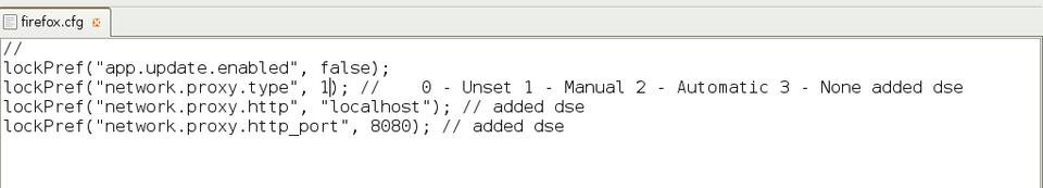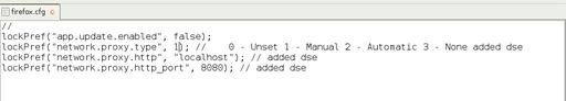 After rummaging through Mozilla.org's Web site, I chose to add lockPref statements to my Firefox configuration file to keep users from changing connection settings. I edited the file /usr/lib/firefox/firefox.cfg to appear as the one shown in Figure 5. The last three lines force a manual proxy selection on localhost, port 8080. After saving this file and restarting Firefox, you can't reset the connection settings. Further, other users without administrative privileges could not quickly change the settings and bypass the filters.