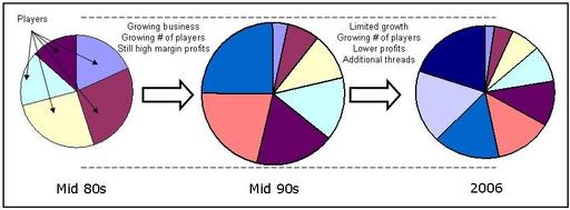 Figure 1 illustrates the state of the telecom business beginning in the mid-1980s up to the present. In the 1980s, the carrier's business was monopoly-based with very few players in the field, which provided carriers the opportunity to make a lot of money, due to significant margins with voice telephony as a high-priced premium service. In the mid-1990s, new players (carriers/operators) entered the business, increasing the competition. However, voice telephony was still a premium service, and although prices were falling, operators still had significant margins. Today, the business looks very different. It is shrinking with many more players in the space, increased competition and much diminished profits. Voice telephony is a commodity. Furthermore, the industry faces additional threats, such as VoIP and broadband telephony. How can they beat free or close-to-free calling?