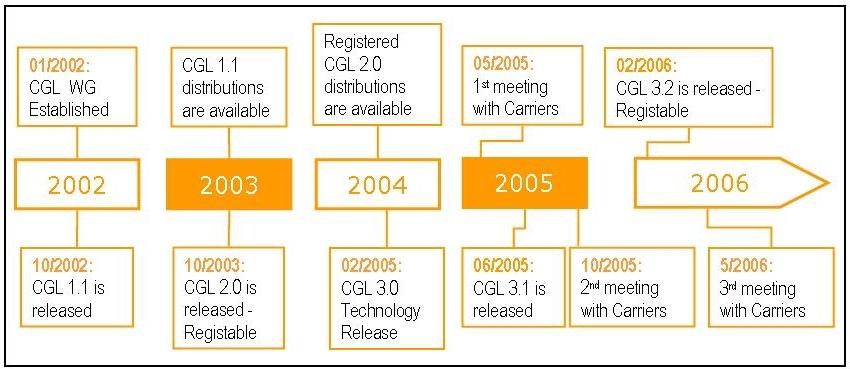 The CGL initiative released the original CGL Requirement Definition Document in 2002 (v1.1) and has issued two revisions (v2.0 and v3.2), and it also has established a registration process for Linux vendors to register compliance of their Linux distributions.