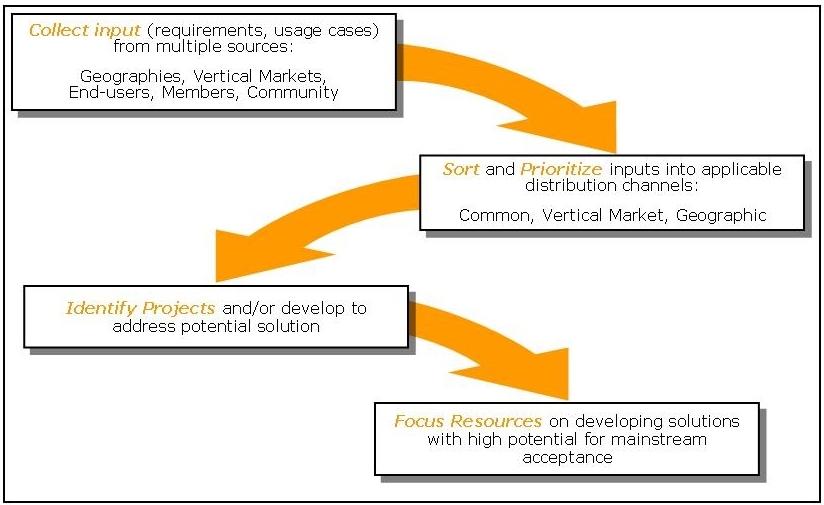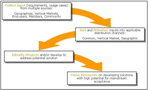 The CGL working group collects requirements from multiple industry sources and develops use cases for the various proposed capabilities and functionalities. The working group then sorts and prioritizes the input from the industry, member companies and end users to identify open-source projects that are working on these areas. If no open-source project exists, the working group starts new open-source projects to develop these capabilities and focuses its resources to develop solutions with high potential for mainstream acceptance. In many instances, member companies have (re)released previously proprietary technologies as open source to accelerate the availability of these capabilities in Linux.