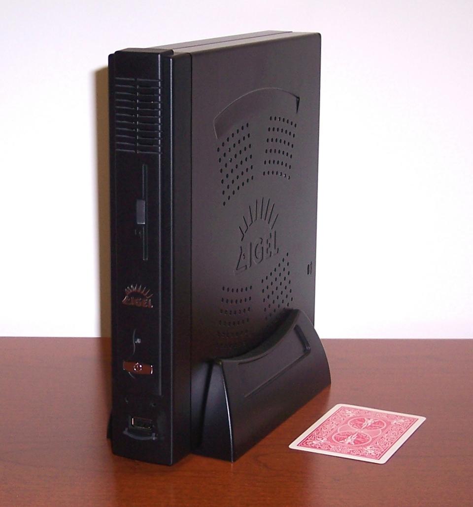 Because there are no internal drives or expansion cards, motherboard components are reduced, allowing very small form factors. The small form factor, reduced cooling requirements and lack of drives mean a very small enclosure. The model I typically use measures 9.5" tall and 1.75" wide, and has a maximum power consumption of 30W. The smaller power supply also means a smaller UPS. Compare a 700 VA workstation UPS costing $120 US and weighing 17 pounds to a 350 VA thin-client UPS costing $40 US and weighing 11 pounds.