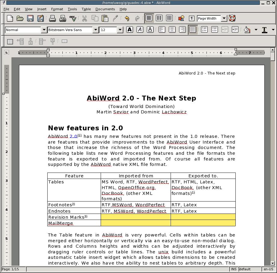 Two word processors fit the bill nicely: KWord and AbiWord. We could justify giving either of these the Editors' Choice Award. We went with AbiWord 2.4.4 primarily because it has a slightly more familiar look and feel for Microsoft Word users, and because it sports a number of very useful plugins. For example, one plugin allows you to place the cursor on a word and run a Google search on that word. Another lets you look up the word in Wikipedia. Still another is supposed to translate selected text via Babel Fish, although that plugin wasn't fully automated in our experiment. Still other plugins add the ability to read and write various document formats, including OpenOffice.org Writer files and Microsoft Word.