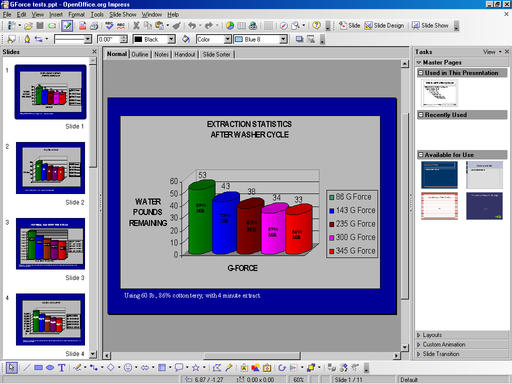 We came back to OpenOffice.org for our choice of presentation software. As with the spreadsheet and the entire suite, it offers that optimal balance of features, power and familiarity for those who want to migrate from Microsoft Office. And, of course, it has the oh-so-important benefit of being open source and supporting an open document format. KPresenter deserves an honorable mention, as does the presentation module in EIOffice.