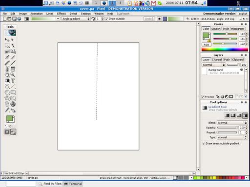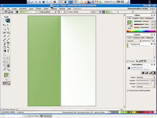 Next, I decided to use Gradient G to spice up the background of the cover. Use your mouse to select the gradient button on the left of your screen (Figure 8). Drag your mouse by pressing the left-mouse button from the top of your cover to the bottom. This tells Pixel which direction to draw the gradient (Figure 9). I mentioned earlier that Pixel's operation is intuitive. When you select the gradient button, look to the bottom right of the screen; the program gives you hints on how to use the feature or effect (Figure 10).