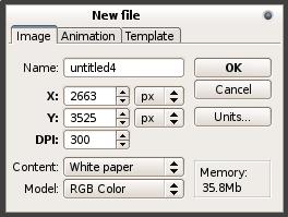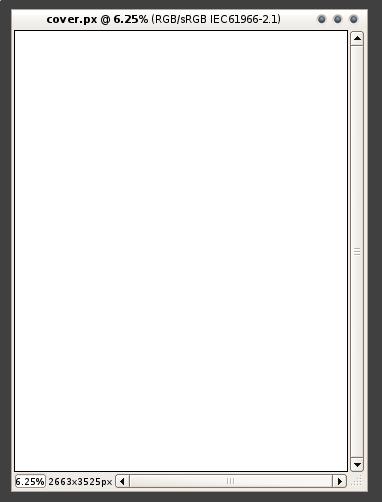 Lulu's standards for an 8.5 x 11 book cover are 2663 x 3525 pixels and no less than 300 dpi. In Pixel, go to File→New, and a creation box opens (Figure 4). Enter the dimensions as shown in the example. In the lower-right corner, you will see the memory requirements for this file are 35.8MB. Press OK, and Pixel creates a blank document template (Figure 5). Now you have a blank page to create your cover art.