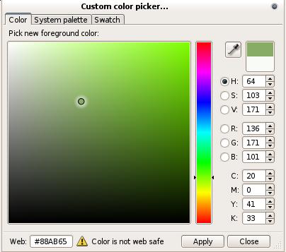 To keep artwork simple for the tutorial, use your mouse to change the foreground color as shown in Figure 6. Pixel opens a color chooser for you to select nearly any shade you want (Figure 7). Choose your colors wisely. Not all will transfer into the shade you expect during printing. You should consider using a color management system if you have specific needs.