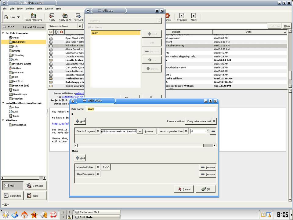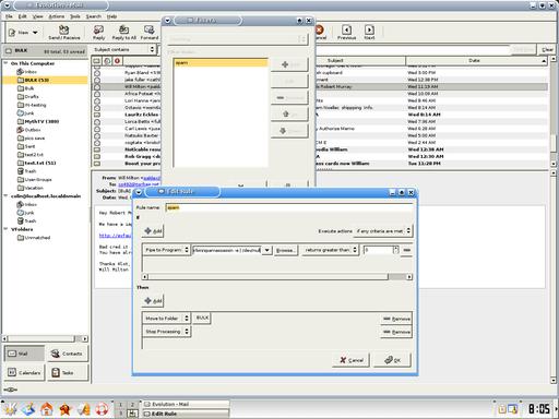 Now, let's further refine SpamAssassin's taste. My first run-through with SpamAssassin was a disappointment. Out of some 2,200 spam messages, only about 10% were correctly identified as spam. Fortunately, with SpamAssassin there is a utility program called sa-learn that will “teach” SpamAssassin what you consider to be spam and ham (non-spam). This process greatly improves SpamAssassin's ability to identify spam messages correctly. The trick here is to create folders, one filled with spam and another filled with the sort of material you want to keep, and then feed each folder into sa-learn. Using the Evolution e-mail program, I created a folder called BULK, and then I manually placed all the spam messages into that folder. Next, I ran the sa-learn program with the following command: