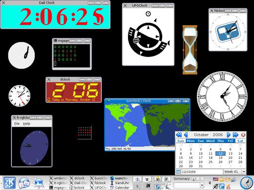 I'm going to pretend that some of you are old enough to remember the 1960 George Pal movie version of H.G. Wells' The Time Machine. In the movie, George, the H.G. character, has a room filled with ticking clocks of every kind: cuckoo clocks, grandfather clocks—you name it—no digital clocks though. If you don't remember that, perhaps you remember Robert Zemeckis' 1985's Back to the Future, starring Michael J. Fox. Doc Brown, played by Christopher Lloyd, has his own lab full of ticking clocks. Guess which one takes its inspiration from the other? Take a look at Figure 1, mes amis, and you'll see a Linux desktop version of George's Victorian home or Doc Brown's lab—depending on your video memory.