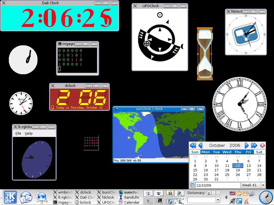 Tim Edwards' dclock, a modification of Dan Heller's original code, is a great digital clock that looks like the old seven-segment LED display clocks. dclock has a number of command-line arguments that let you set the date format, the color of the LED segments (both on and off) and more. For instance, typing dclock -date Today is %A, %B %d -fg yellow -bg brown -led_off brown4 generates the clock in the lower part of Figure 6. Furthermore, while the clock is running and your mouse pointer is inside the active window, you can change various settings with single keystrokes. For example, pressing the S key toggles the seconds display, R reverses the video colors and / increases the angle of the digits. Check the documentation for other one-key changes.