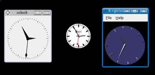 Figure 4. Analog clocks come in many styles, from the classic Xclock on the left, followed by the simple but classy Buici clock in the center, and the spin-happy rglclock to the right.