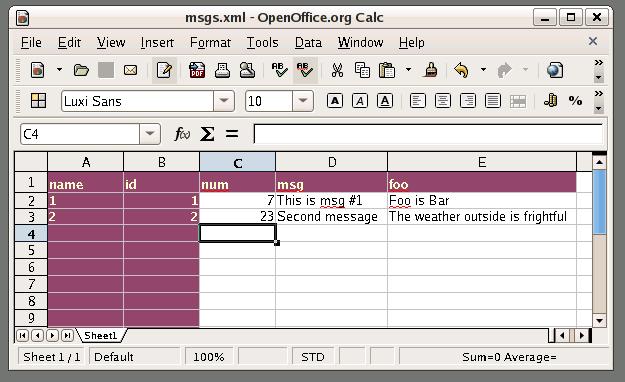 The possibilities become even more interesting when write support in the translated filesystem is considered. After you have made some changes to the above virtual spreadsheet file in OpenOffice.org, you “save” the file. The filesystem then applies a reverse XSLT and updates the input filesystem (in this case a PostgreSQL table) to reflect your changes.