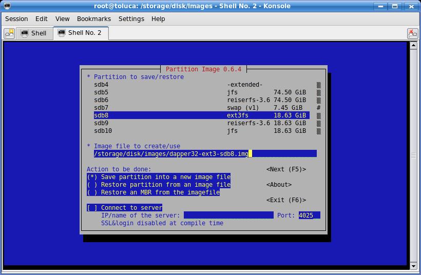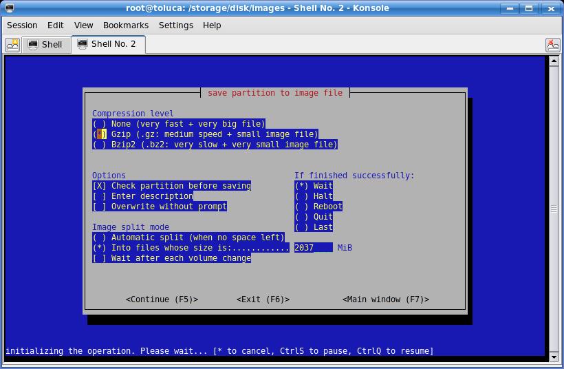 Press Enter, and partimage will create one or more compressed image files of the partition. The rest of the process is self-explanatory.