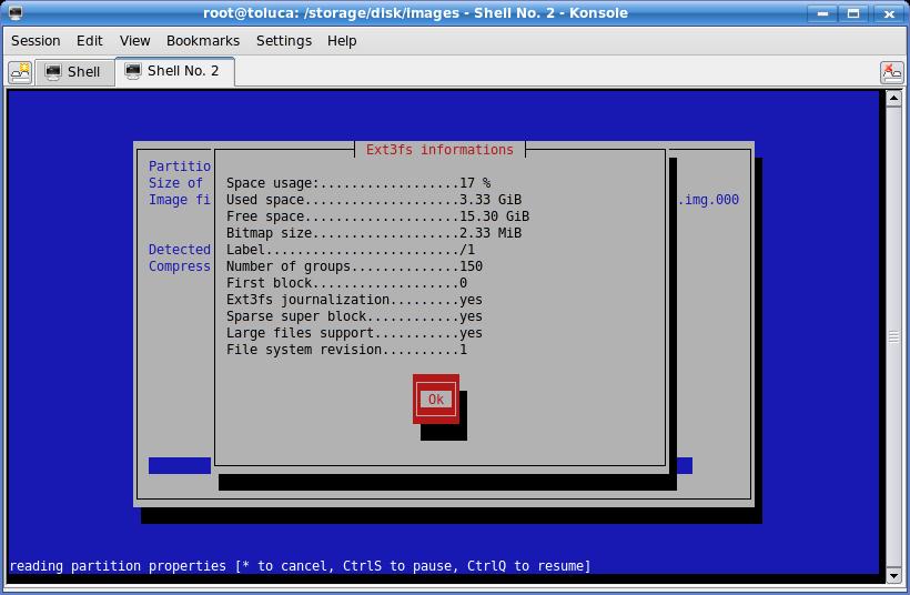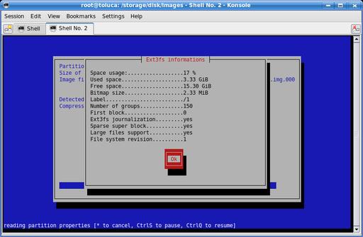 Press F5 to continue. Partimage should get busy checking the filesystem. Partimage can be flaky and sometimes reports errors that do not exist. If you have this problem, check the partition manually (with fsck.ext3, for example), and then uncheck the option to have partimage do it for you. If everything went well, you should see a screen something like the one shown in Figure 4.