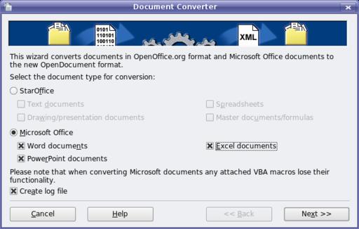 From the menu bar, select File, move your mouse to Wizards, then select Document Converter from the submenu. To convert your Microsoft Office documents, click the Microsoft Office radio button, then check off the types of documents you want (Figure 1). You can do Excel and PowerPoint documents at the same time.