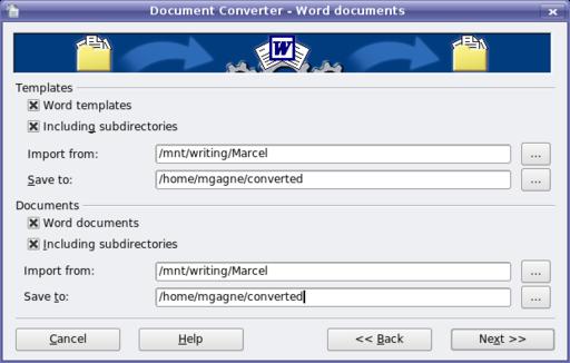 The next screen asks whether you want both documents and templates or just one or the other. You then type in the name of the directory you want to import from and save to. This can be the same directory or you can choose an alternate. You need to answer this set of questions three times if you've chosen to do Excel and PowerPoint files at the same time, but the dialog is the same as the one you'll see for Word documents (Figure 2).