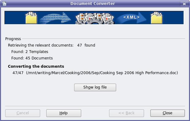 After you've entered your information and gone to the next screen, the program confirms your choices and gives you a final chance to change your mind. Click Convert to continue. As the converter does its job, it lists the various files that it encounters and keeps track of the process. Click the Show Log button to see a listing of everything the converter encountered (Figure 3). When the job is done, you'll have a number of files with .odt extensions in your directory. Spreadsheets will have .ods extensions, and presentations will have .odp extensions. If you change your mind, don't worry. Your original files are still there, so you've lost nothing.