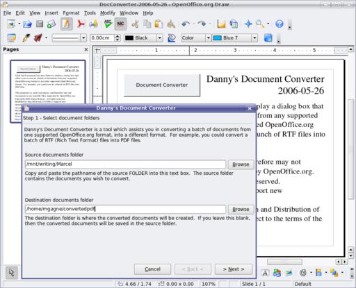 If you have OpenOffice.org on your system, I have just the thing for you. It's an OpenOffice.org macro document called—wait for it—Document Converter, or just DocConverter. This macro, written by Danny Brewer and Don Horwood, is designed to let you do batch conversions of any document format OpenOffice.org supports to any other format it supports easily. In other words, the output doesn't have to be PDF, as there are a number of alternatives you can choose. You can find the Document Converter at the OpenOffice.org Macros Web site (see the on-line Resources). Macros are sorted into end-user applications and those suited to developers. Click the For End-Users link at the top of the page, and scroll down to find Document Converter.