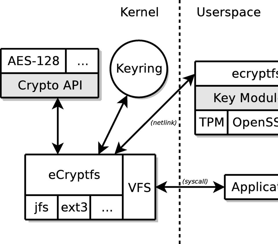 Application file operations go through eCryptfs, which communicates with the kernel crypto API, the kernel key ring and the user-space eCryptfs dæmon to perform encryption and decryption. eCryptfs manipulates files in lower filesystems, such as JFS or ext3.