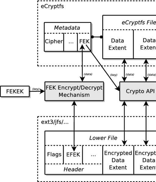 eCryptfs encrypts and decrypts individual data extents in each file using a unique randomly generated File Encryption Key (FEK). The FEK is encrypted with the File Encryption Key Encryption Key (FEKEK), and the resulting Encrypted File Encryption Key (EFEK) is stored in the header of each lower file.