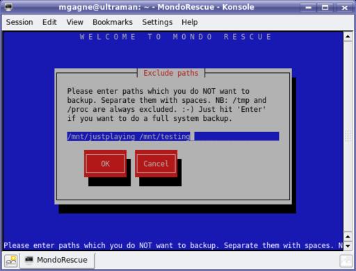 Next, is the Backup Paths screen. By default, everything is backed up from the root (/), on down. Most people will be happy with this and can safely move on to the next screen. Incidentally, should you happen to have a system with NTFS partitions (such as on dual-boot systems with Windows), Mondo Rescue offers to back up those as well and informs you of their presence. You can accept these or remove them from the list of backed-up partitions.