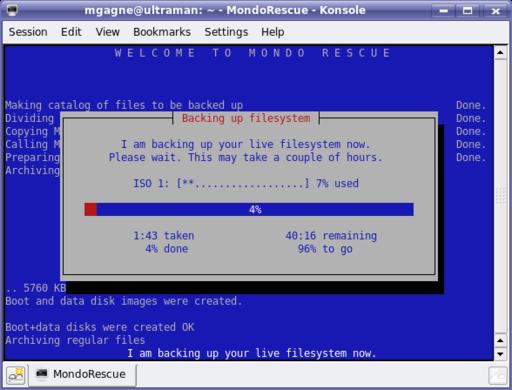 What follows next is interesting only the first few times—mostly because you probably have better things to do with your time. The screen shows a report of the backup broken up into file sets, the creation of boot diskettes and so on. At this point, Mondo Rescue is ready to back up your data and displays a nice progress bar, telling you which ISO is being written, how much of it is done and how long you can expect the whole process to take (Figure 5).