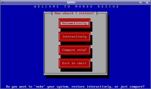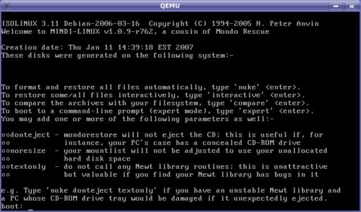 Eventually, you will have a complete backup and, in this case, one or more ISO images that you can burn to a CD or DVD. The first disk in the set is the one from which you'll want to boot. In a few seconds, you'll see a menu like the one shown in Figure 6 (currently running in a QEMU virtual machine).