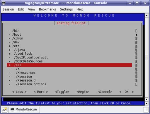 As excellent as the wine might be (and it is), the real star of tonight's menu is a powerful backup and system recovery program called Mondo Rescue. The spirit of Mondo Rescue resides in a scenario no one wants to envision, a catastrophic system failure. I'm not talking about losing your e-mail folder (although I would consider this a catastrophe as well). Mondo Rescue is concerned with “the hard disk is gone, the machine has exploded, and we need to start from scratch” kind of catastrophe. Or, as in François' case, security enhancements gone terribly wrong. Mondo Rescue works with a variety of backup media, and it can create bootable backups that let you restore a mirror image of your system prior to the disaster.