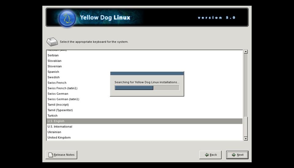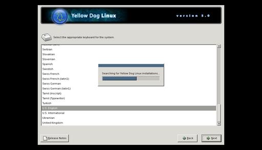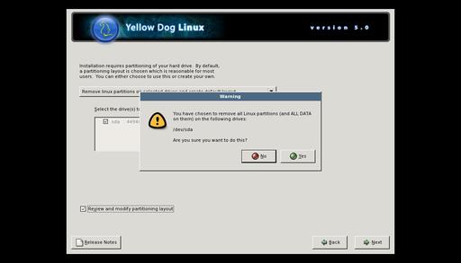 After a minute or two of streaming text, you'll get to the YDL Version 5.0 install screen in Anaconda, where you can now start clicking on Next until your mouse button gets tired. Actually, just a few clicks in you'll find that the system complains that “The partition table on device sda was unreadable” and asks if you want it to initialize the drive, erasing all data. You do want to do that, and as always, I recommend you choose automatic partitioning.