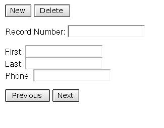 Figure 1 shows how our application allows us to insert a new contact record or delete the current record by pressing the buttons at the top. At the bottom of the application, we can move to the previous or next record in the database. Of course, we have input fields to hold the first and last name as well as the phone number. We also have a form field to display the record id number. In a real application, I'd probably make this a hidden field, but for the sake of instruction, I've left it visible.
