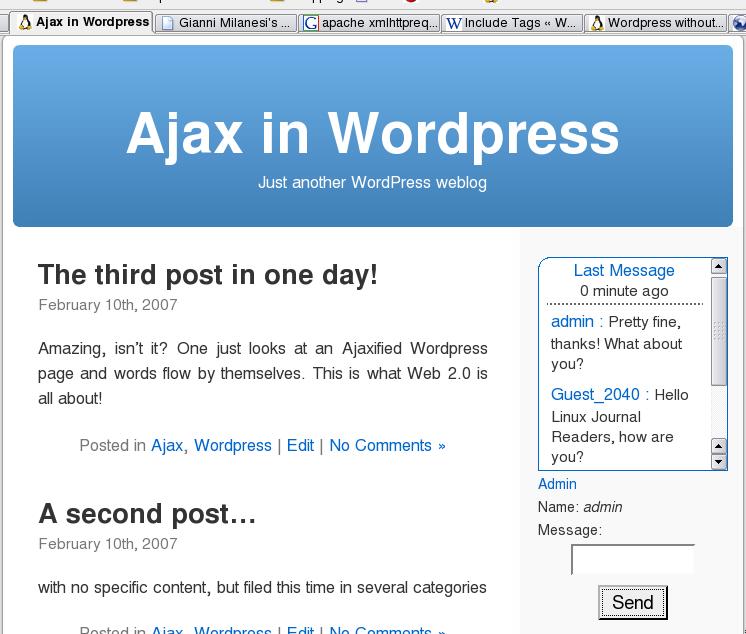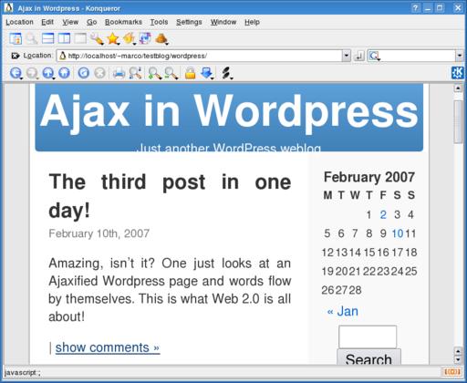 AjaxWp depends on a few JavaScript libraries that are included in the distribution. To use this plugin, download the latest tarball from the home page, unpack it, and move its JavaScript folder, the animated GIF and a PHP file called, you guessed it, ajax-wp.php, inside your WordPress installation. Then the fun begins.