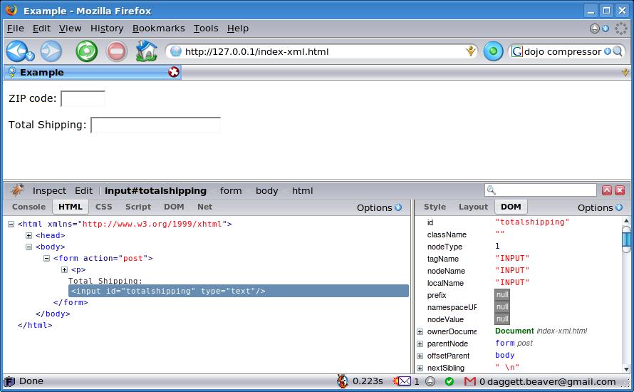 Web designers have been using this capability for a long time. The real power in Ajax comes from the ability to calculate the value for the total at the server side rather than at the client. To keep it simple, here's an example that doesn't really involve any server activity other than returning a result. This example presents a simple form that lets you type in a zip code. When you change the value of the zip-code field, the JavaScript code executes a PHP script at the server side that returns the shipping cost to that zip code. The JavaScript code then modifies the totalshipping field to reflect the server response.