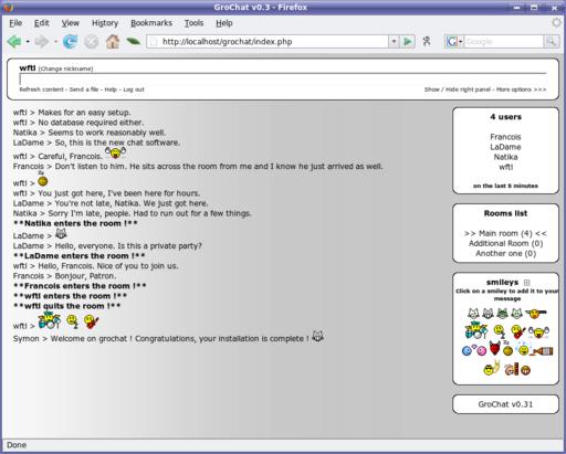 Tonight's menu features two Ajax-based chat programs. The first is Simon Oualid's GroChat (Figure 1), an easy-to-use chat application that you can integrate into your own Web site. GroChat's features include public as well as private chats, a private file exchange system, multiple chat rooms, client-side chat history (so you can catch part of an earlier conversation) and more. It's frightfully easy to set up and requires no database. You do, however, need an Apache Web server with PHP to use GroChat, but that's pretty much it.