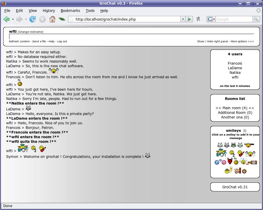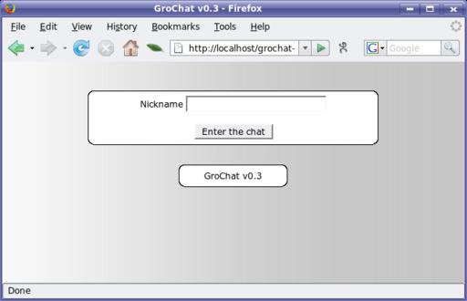 GroChat comes in a zip file. To install it, extract it somewhere in your Web server's path. The files will arrive in a directory with the release number (for example, grochat-0.33), so you may want to rename it to something less verbose, such as grochat, before you continue. Inside the release directory, there's a subdirectory named chatfiles. The text files inside need to be writable by your Web server—for instance, if your Apache user is apache with group apache, type: