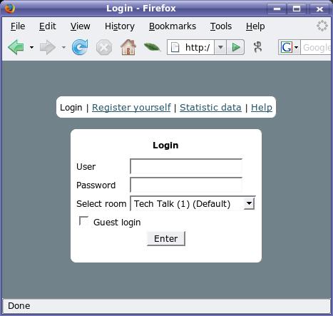 When the setup is complete, visiting http://www.yourwebsite.dom/chat will take you to a login screen (Figure 5). From there, you can either log in or register before logging in. Two additional options are worth mentioning at this point. Statistical data will tell you what rooms are available, how many users are registered, the amount of traffic on the site and a few other items, without going into private details or conversations. There's also a help link that will show you some of the commands available in a chat session.