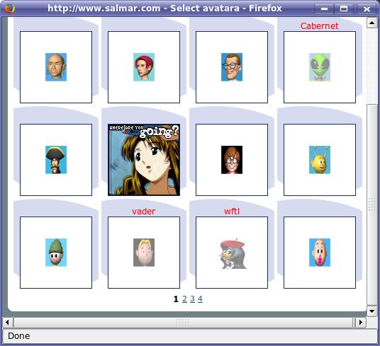 Users don't have to register to join the chat, but some nice features are associated with doing so. For one, your nickname is protected, and no one else can impersonate you. Furthermore, the system keeps statistics on how many messages you've sent, your date of registration, last time on and so on. Registered users also can select an avatar to represent them. To do that, type /avatar in the text entry field. A pop-up window appears with a list of several avatars (Figure 6). These are included with the AjaxChat distribution, and are located in the img/avatars subdirectory of your chat directory. Adding your own avatars is as easy as adding them to the avatars subdirectory. Don't overdo it though. Most of the included images are 30x40 pixels.