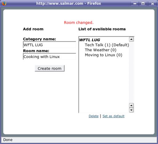 Click the Create room button, and that's it. You can add as many rooms as you like or delete existing rooms via this dialog. You also can define any of the rooms you create as the default room—that's the room users find themselves in when they log in to the AjaxChat session.