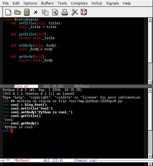 Suddenly the window is split, and you have an embedded Python interpreter below the file you are editing (Figure 2). And the fun is only beginning. Click on the file you are editing to set the focus on it. Run Import/reload file from the Python menu or press Ctrl-C Enter. Now, you're ready to test your code on the REPL, but be aware that you'll have to add blog. before the name of the class, Post, because now the class is in the module blog. See Figure 2 for further reference.