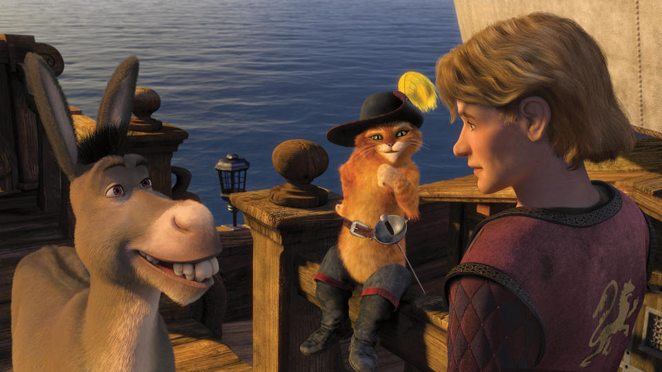 “I'm the head of layout”, says Nick Walker, “which makes me the DP.” Layout is the group that figures out where the virtual actors will stand in virtual sets. “Shrek is seven feet tall and all torso”, says Walker. “Shrek could swallow Fiona's head when moving in for a kiss. Puss n' Boots and Donkey, the two sidekicks, are different sizes. It's difficult to get a two-shot.”